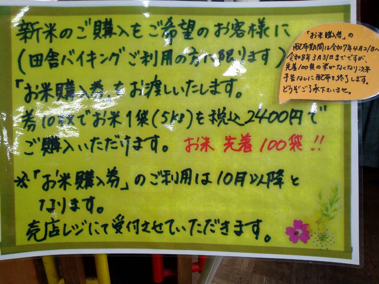令和7年4月21日~配布を開始させて頂いておりました、新米購入引き換えを10月1日(水)AM9時より売店にて販売開始させて頂きます。お米購入券10枚と2,400円で新米5kgと交換させて頂きます。先着100名様とさせて頂きます。