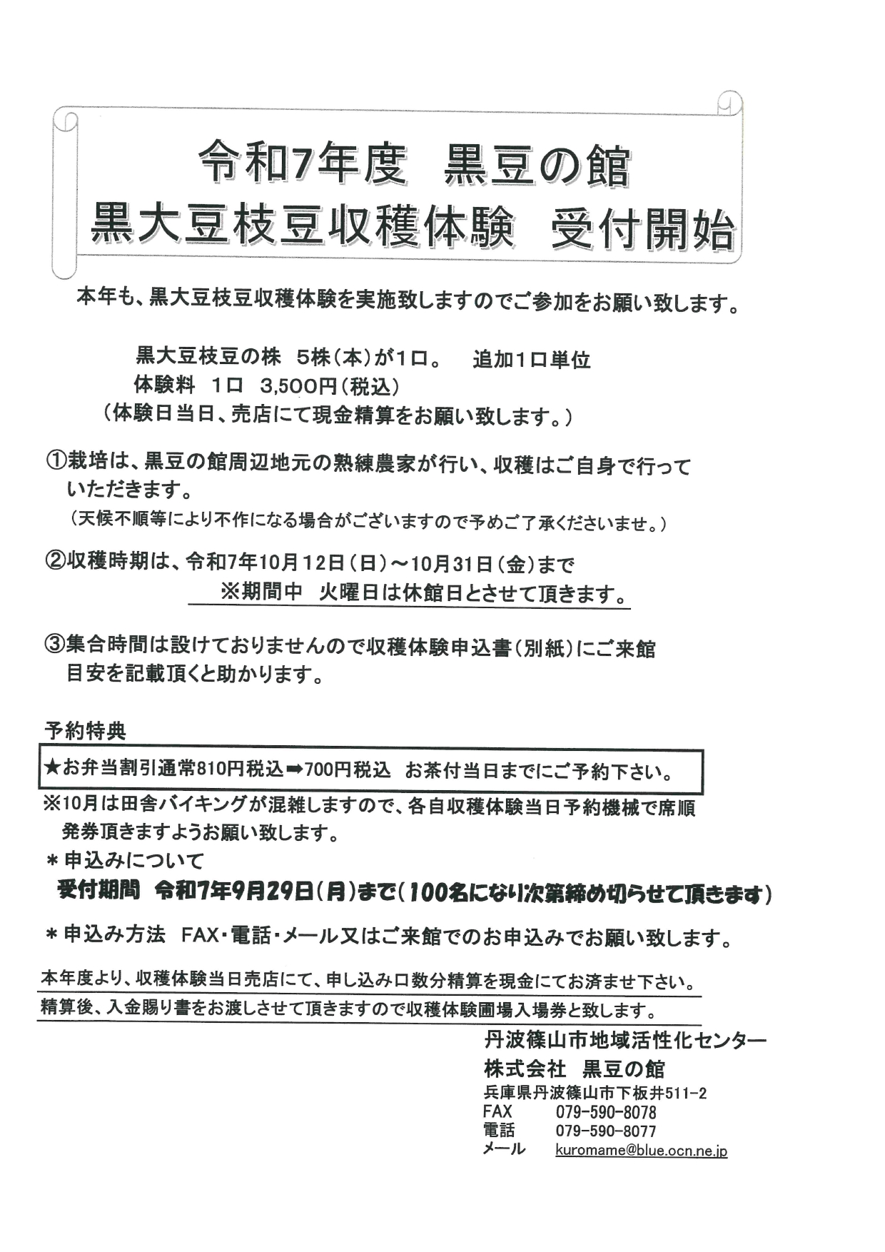 黒豆の館では10月10日(金)より、店頭販売開始させて頂きます。